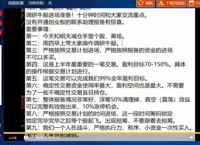 李文学回忆,早在4月12日,助理“君子”就向群內扔进了名为“牛散第一俱乐部”的直播间课堂链接。该直播一般每天进行三次,上午开盘时间为9:30-11:30,下午盘中为13:00-15:00,晚上为19:00-21:00。“6.11”到来前,除了周末,这样的直播间授课几乎不曾间断过。