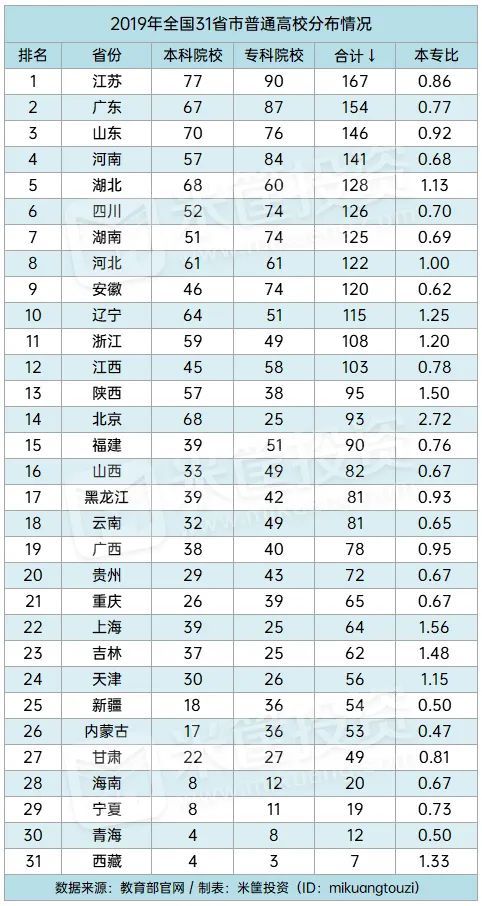 总量排在前列的河南、四川、江西,明显是由专科院校数量撑起来的,本科专科的比例有点失衡。