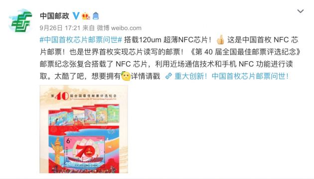 9月26日,中国邮政官方微信公号发布消息称,中国邮政发行《第40届全国最佳邮票评选纪念》邮票纪念张,这是中国首枚芯片邮票。