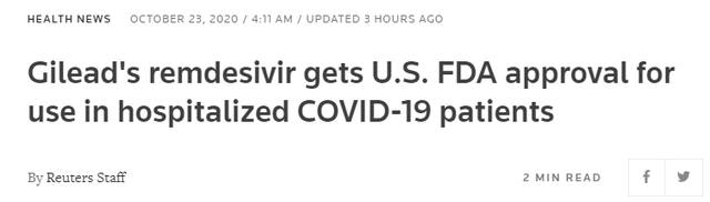 据路透社报道,美国食品与药品管理局(FDA)当地时间周四(22日)为美国吉利德科学公司的瑞德西韦(Remdesivir)开绿灯,批准该药物用于住院的新冠肺炎患者。瑞德西韦也成为美国首个获准用于新冠患者的药物。