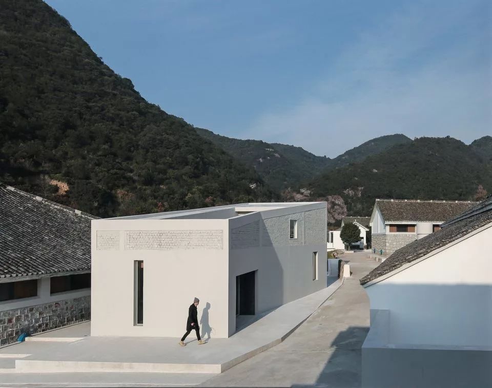 因为地域风貌淳朴再加上远处的自然山景,新建筑在型体,体量和材料运用上都尽可能的保持低调,用抽象简洁的几何来回应环境。