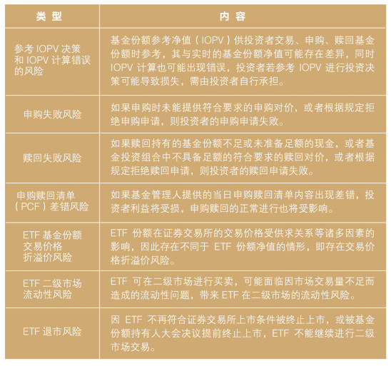 ETF特有风险主要包括参考IOPV决策和IOPV计算错误的风险、申购失败风险、赎回失败风险、申购赎回清单(PCF)差错风险、ETF份额交易价格折溢价风险、ETF二级市场流动性风险及ETF退市风险等,具体如下表所示: