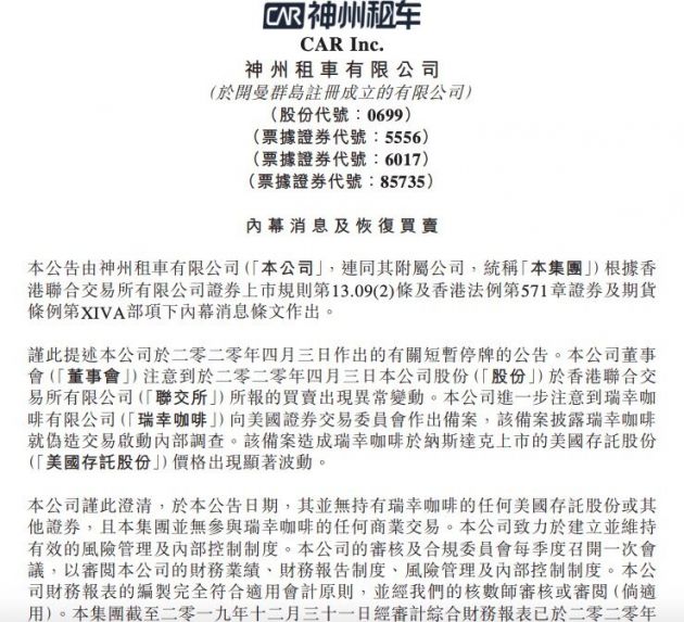 神州租车:公司并无持有瑞幸咖啡任何美国存托股份或其他证券
