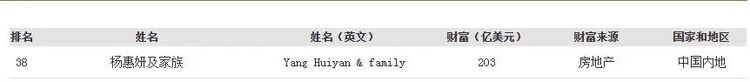 ·2020年福布斯亿万富豪榜单中,杨惠妍及家族财富为203亿美元(约合人民币1313亿元)。