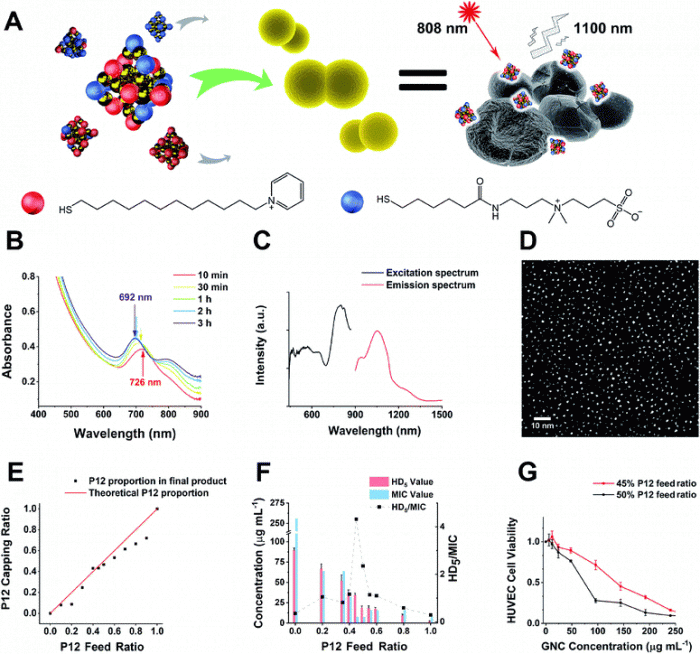 金纳米簇被包装在一个分子包络物内,帮助它们到达细菌而不伤害宿主细胞。这个封套由两个配体组成--第一个配体带有正电荷,被细菌的负电荷所吸引,而第二个配体是所谓的齐聚物,它同时含有正负电荷。由于这些也存在于哺乳动物的细胞膜中,这有助于包装忽略宿主。一旦它的工作完成,这也有助于它通过肾脏并通过尿液排出体外。
