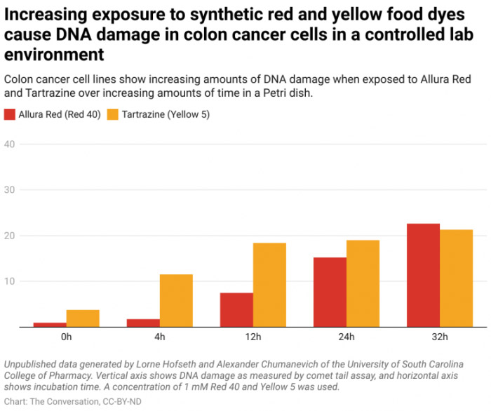 已发现合成食品染料会损害啮齿动物的DNA。Hofseth的研究团队未发表的数据支持了这一点,这些数据显示,Allura Red(或称红40)和Tartrazine(或称黄5)在受控的实验室环境中,随着体外接触剂量和时间的增加,可以导致结肠癌细胞的DNA损伤。然而,他们的结果需要在动物和人类模型中进行复制,然后才能说这些染料直接造成了DNA损伤。