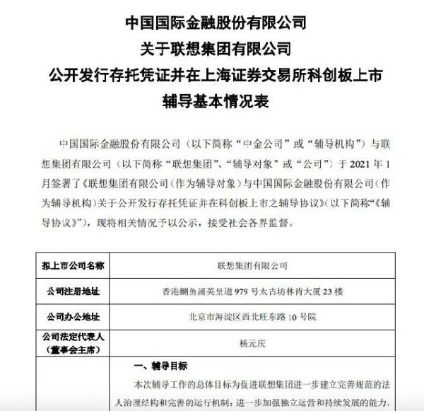 导读:1月27日消息,根据北京证监局披露的信息,中金公司与联想集团签署了上市辅导协议,后者拟公开发行存托凭证并在上海证券交易所科创板上市。