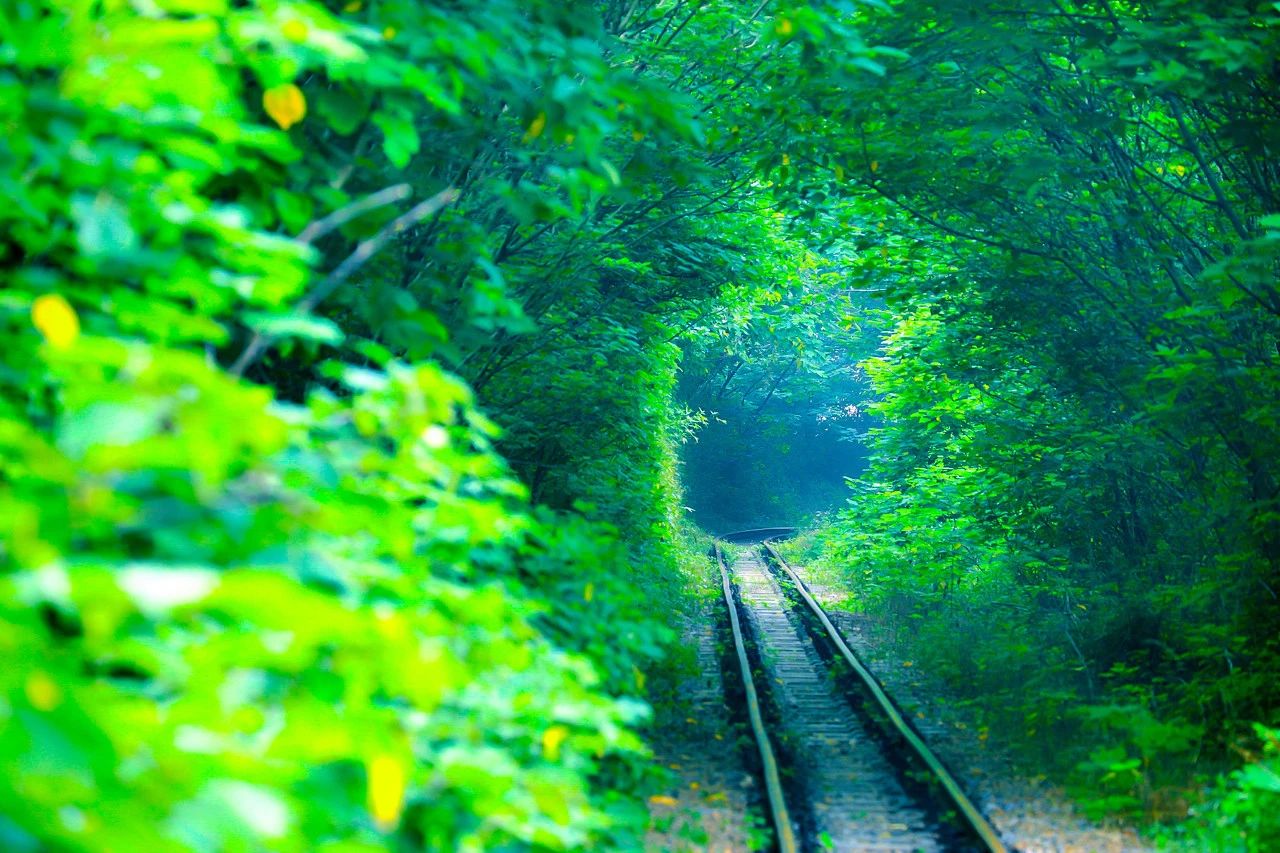 天晴的时候,阳光不断从树叶的缝隙中照射下来,洒落在铁轨之上,放眼望去,如仙境一般…