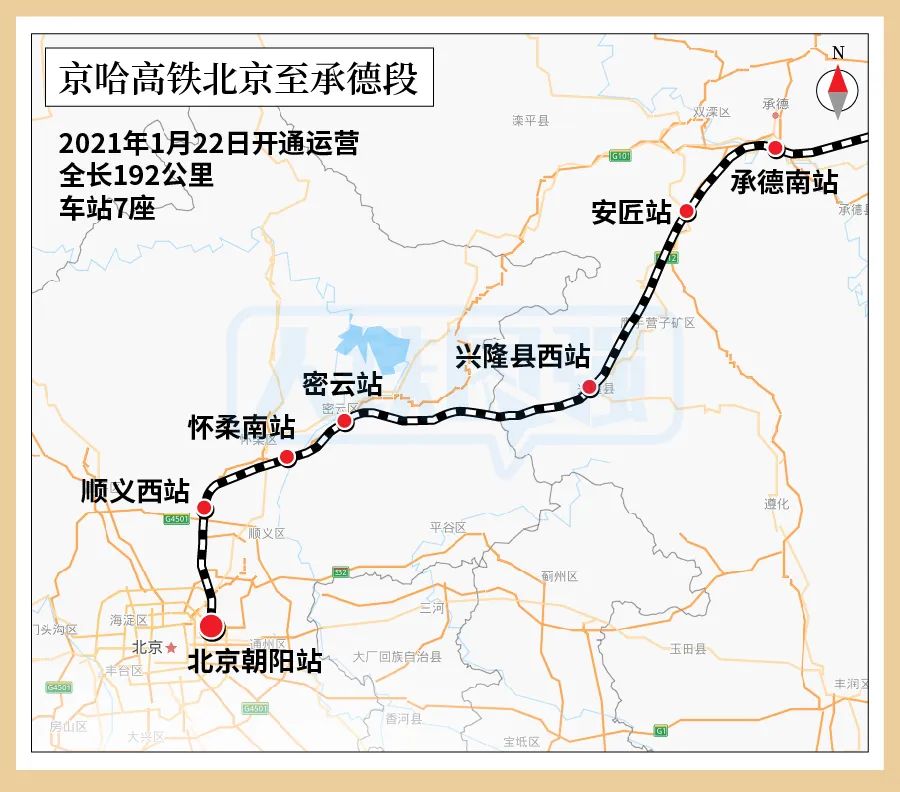 此次开通的北京至承德段长192公里,设北京朝阳、顺义西、怀柔南、密云、兴隆县西、安匠、承德南7座车站。