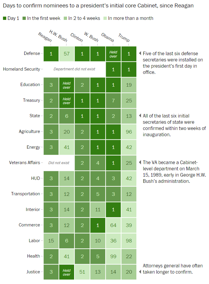 《华盛顿邮报》梳理了拜登之前的六位总统内阁上任用时情况。即使是川普的内阁团队比之前几任总统都花费了更长时间确认,但国防部长和国土安全部长也在川普就职第一天就通过了参议院。