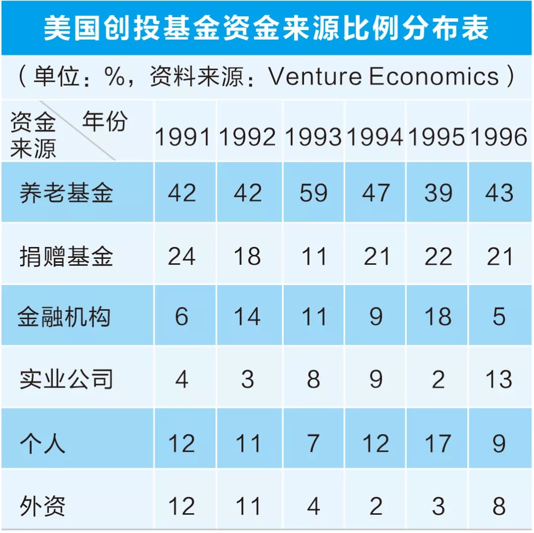 由于创业投资基金从事长期投资,因此,境外特别注重拓宽长期资本来源。如美国在1978~1980年间两度修改《雇员退休收入保障法案》,不仅使得养老基金在“不威胁整个组合安全”前提下,可将不超过一定比例的资金投资于创业投资基金,而且通过制定“安全港”豁免条款(养老基金的受托人可以不被当作受监管基金管理人),激励基金管理机构募集养老基金的资金从事创业投资。到上世纪90年代,养老基金即成为创业投资基金最重要的资本来源(见附表)。