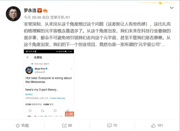 关于元宇宙,推特主@Shaan Puri对于元宇宙的理解让罗永浩印象深刻。