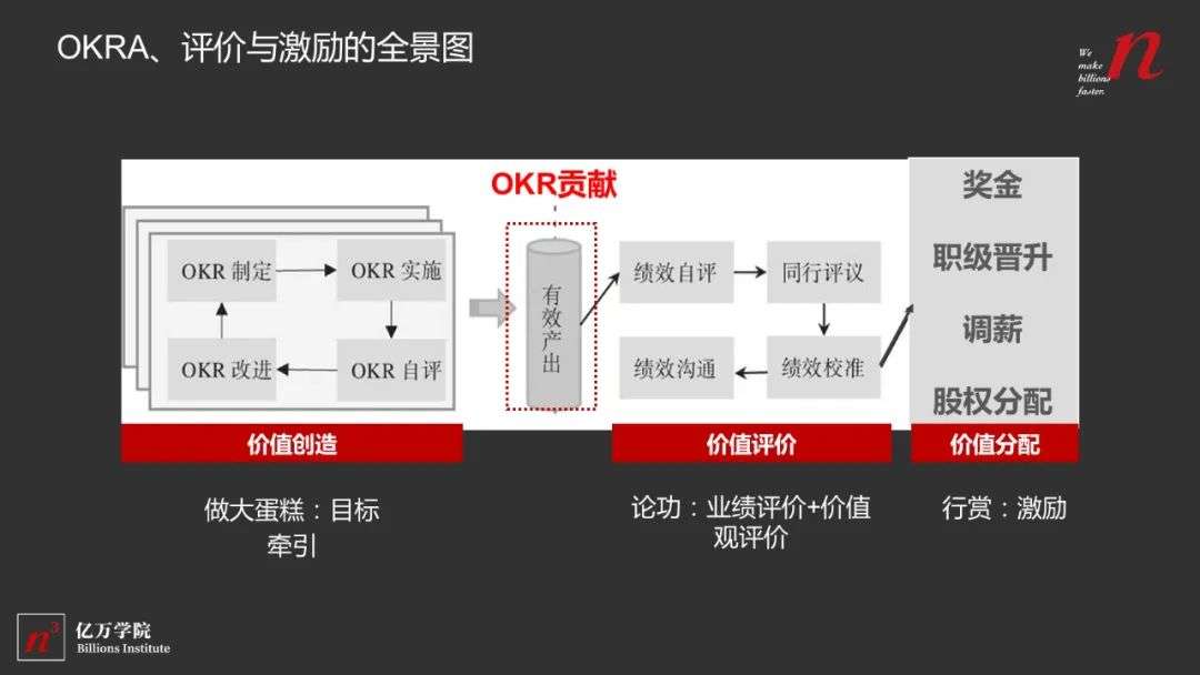 在这里面大家可能会纠结OKR和考核、KPI到底什么关系,我觉得根本就不应该混淆在一起。OKR是解决什么问题的?解决价值创造、怎么把目标做大。然后才是价值的评价。KPI是评价的标准,决定你的级别、决定你的收入水平。这完全是两码事。基于OKR有效的产出,然后再做评价,然后再做决定,这叫论功行赏,决定你价值分配、晋级、调薪、职权等。另外强调一下,绩效评价一定不能只根据财务结果,还要根据员工的表现、价值观和团队协作等。