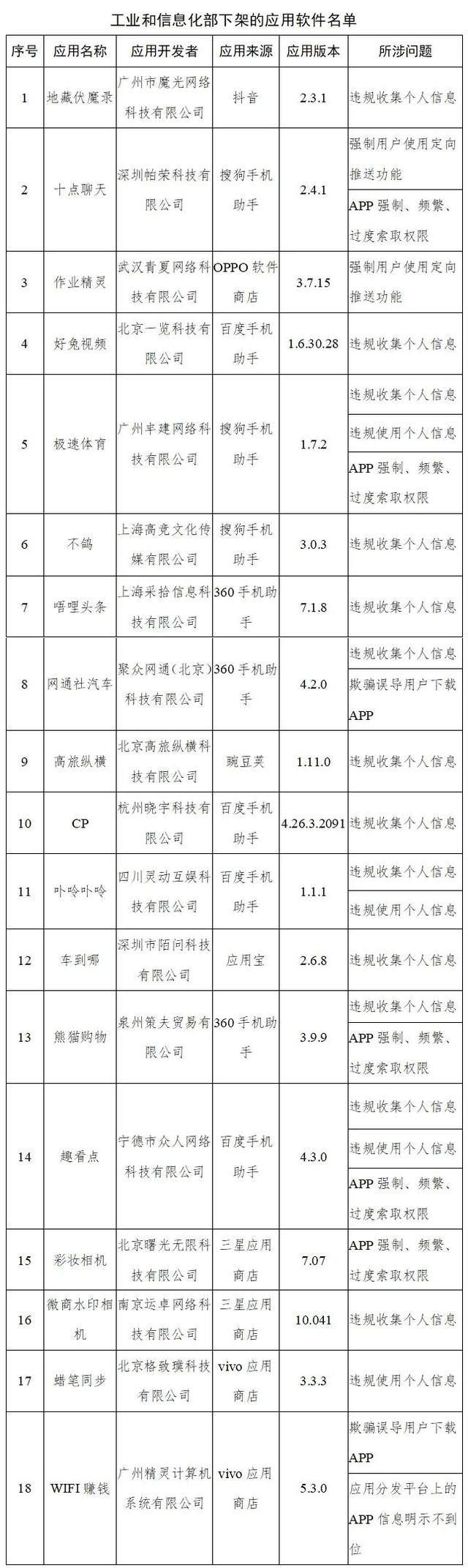 7月12日,工信部发布《关于下架侵害用户权益APP名单的通报》,通报显示,2021年第5批(总第14批)公开通报APP,经第三方检测机构核查复检,截至目前尚有18款APP未按照工信部要求完成整改。上海、安徽、广东、四川省(市)通信管理局检查发现共有30款APP仍未完成整改。