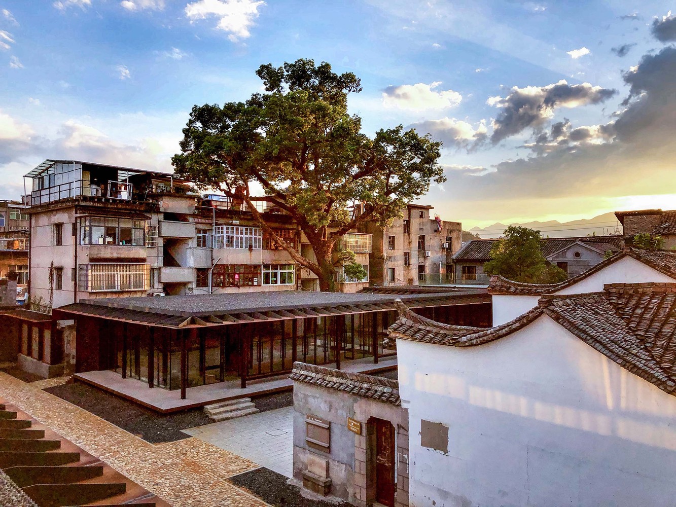 刘家琨事务所在梳理场地时反复与居民协商,于一尺一寸的进退中切削出场地边界,疏解后期加建以恢复原有街区肌理。这种方式被建筑师形容为“泥鳅钻豆腐”。他们在梳理后的基地内植入更新系统——一个蜿蜒连续的深红色耐候钢廊道。廊道对于现状树木和保留遗存进行了审慎退让。整体营造出一个既公共开放又富于传统情致的当代园林。延续两庙街区原有的庙堂文化和市井文化脉络,书店、咖啡、美术馆、非遗工坊、民宿等业态被植入,为周边社区乃至整个松阳提供一个公共文化交流场所。