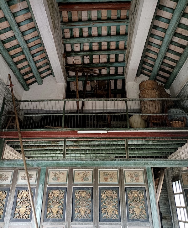 木门之上还有一层小阁楼置放杂物,顶端天花是最大亮点,中式梁架结构,粗细横竖相间,每根木梁都刷着绿漆,只是难免岁月斑驳的痕迹。