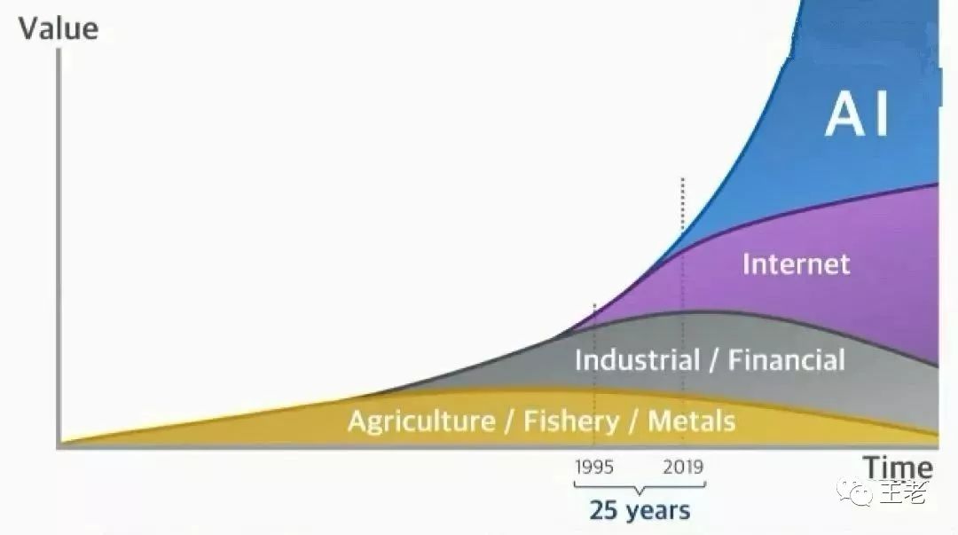 未来在这里,数轴代表价值,横轴代表时间,底部的黄色,代表农业,其价值与时间的比例一目了然。灰色代表工业,紫色代表互联网,也就是我们正处的时代,而未来最有价值的东西,是属于蓝色的,是属于AI的。