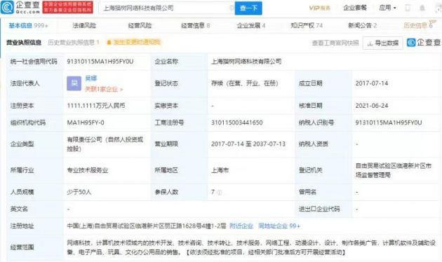 企查查APP显示,6月24日,上海猫树网络科技有限公司发生工商变更,新增B站关联公司上海哔哩哔哩科技有限公司为股东,持股10%。同时,公司注册资本由1000万元人民币增加至1111.11万元人民币,增幅为11.11%。