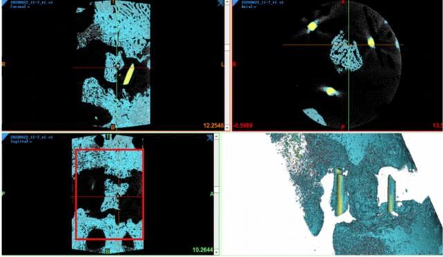 实验用的大型动物是羊,上图为植入后6个月的复合效果。其中红框里面蓝色部分表示骨骼,黄色部分则为植入物。“在X光下我们可以清晰地看到植入物的位置,还可以看到骨骼不仅长到了它的周边,还长到了它的内部。骨骼和植入物形成了一个很好的复合材料,既符合力学,又保证骨骼内部养料能够充分滋养骨骼,因此骨骼就能长得非常结实。”张靖告诉DeepTech。