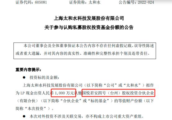 投资界6月16日消息,上海太和水科技发展股份有限公司(简称:太和水)发布公告,公司拟作为LP出资参投国悦君安四号(台州)股权投资合伙企业(有限合伙),基金认缴出资总额为2.07 亿元,其中太和水拟认缴出资1,000万元,上海国悦君安股权投资基金管理有限公司(简称:国悦君安)为执行事务合伙人。
