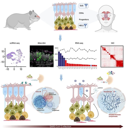 研究人员们随后进一步探索了这些嗅觉受体下调的机理。他们指出,嗅觉受体在表达时,会受到嗅觉感知神经元核结构(OSN nuclear architecture)的调控——在这些神经元里,分布在不同的染色体上的嗅觉受体基因簇会汇聚在一个区域里,使得嗅觉受体基因能够稳定转录。既然这些基因的表达水平出现明显下调,会不会是这些核结构出了问题?