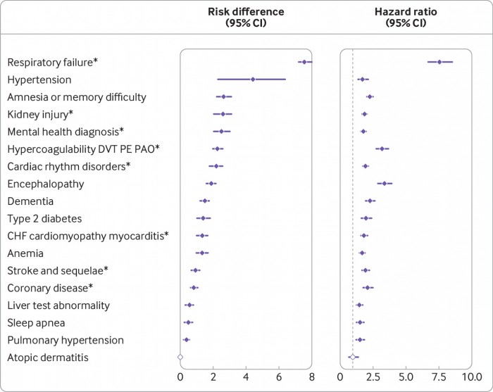 与2020年对比组相比,COVID-19患者患一系列疾病的风险增加,包括呼吸衰竭(每100人多出7.55人)、疲劳(每100人多出5.66人)、高血压(每100人多出4.43人)和精神健康诊断(每100人多出2.5人)。研究人员在2019年的对比组中也发现了类似的结果。