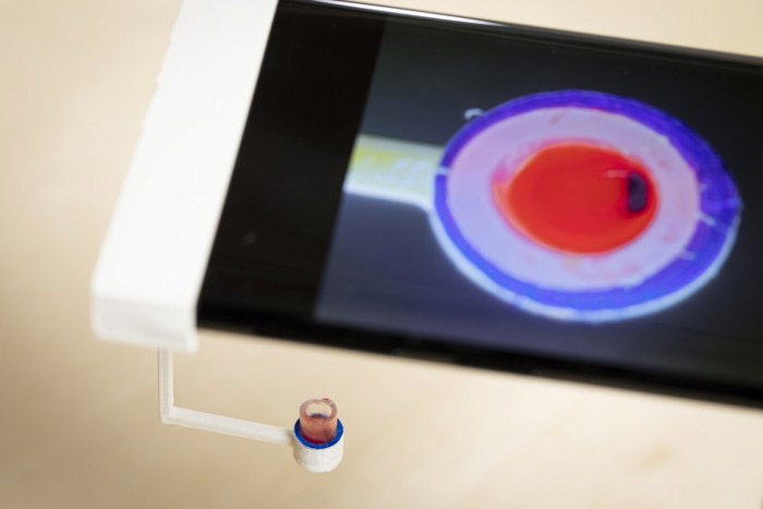 在博士生Justin Chan、Kelly Michaelsen博士和Shyam Gollakota教授的领导下,华盛顿大学的科学家们开始将这种测试带到病人自己的智能手机上。由此产生的原型系统包含了一个低成本的塑料装置,它安装在手机的一端,将一个小杯子悬挂在手机摄像头下方。