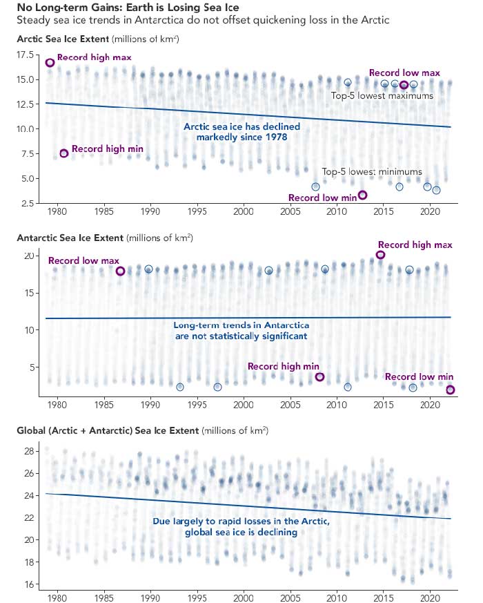 每年,南极的海冰都会有很大的变化;自2013年以来,南极的海冰达到了有记录以来的最高值和最低值。2014年和2015年海冰增长的激增则增强了长期记录中的小幅上升趋势。但在过去的七年里,海冰普遍处于或低于平均水平,其中包括2017年和2022年的最低纪录。现在的长期趋势似乎是平缓的,并且由于变化性不被认为有统计学意义。