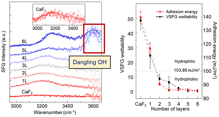 此外,研究人员还定义了VSFG润湿性的新概念,即形成强氢键的水分子跟形成弱氢键或无氢键的水分子的比率。VSFG的润湿性跟粘附能密切相关,粘附能是由观察到的宏观WCA测量值计算出来的。这证明VSFG是定义材料表面润湿性的一个有效工具。