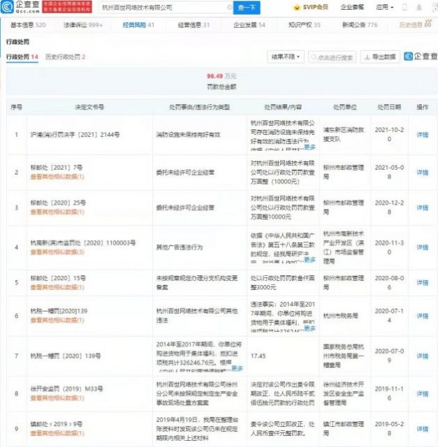 百世集团收到纽交所退市警告,企查查显示关联公司有多项行政处罚