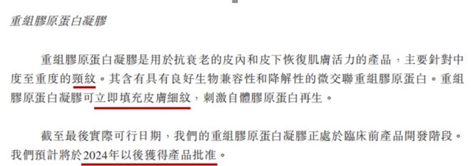 在招股说明书中,巨子生物将针对颈纹的重组胶原蛋白凝胶和法令纹的交联重组蛋白凝胶的面市时间定在了2024年。