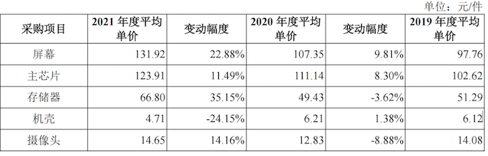可以看到,2021年公司屏幕、主芯片、存储器、摄像头、功能IC等原材料的平均采购单价确实出现了不同程度的上涨,提高了公司的营业成本。