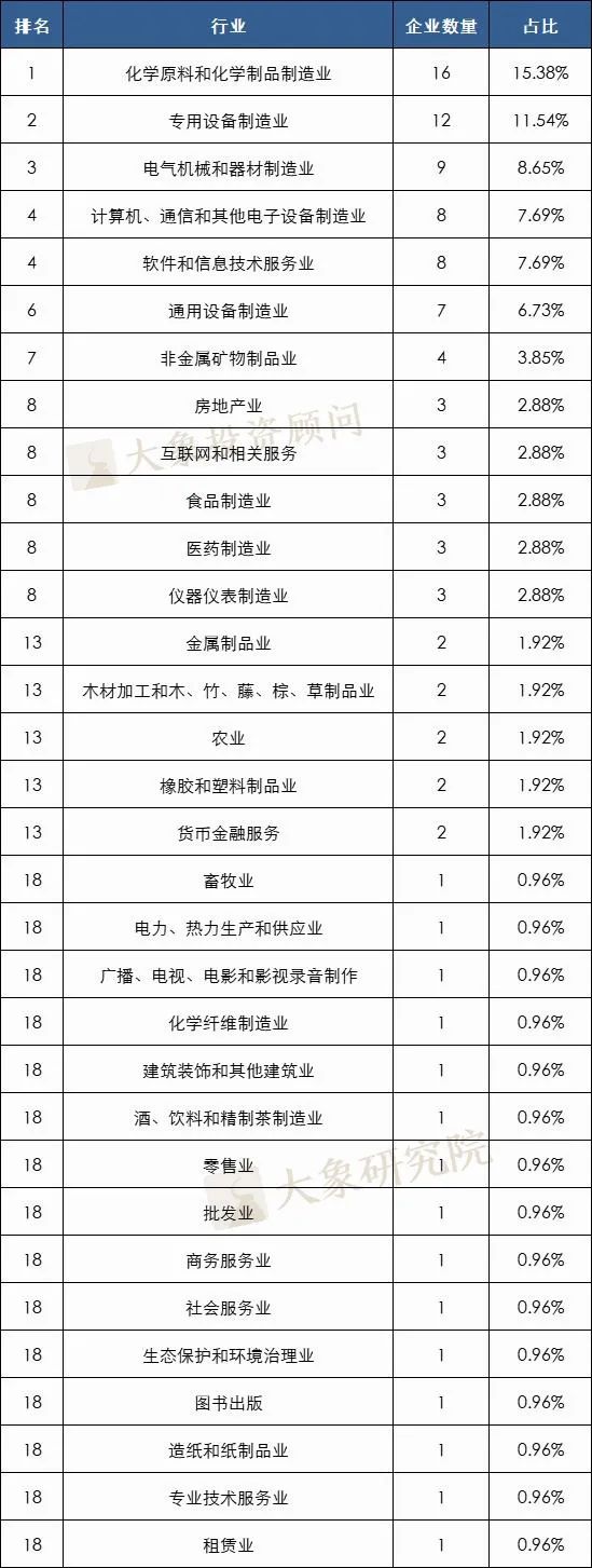 排在第二位的是专用设备制造业,有12家,占比11.54%;