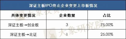 深证主板IPO终止企业变更上市板块的有4家,其中深证主板转战创业板的IPO终止企业有5家,深证主板转战北证的IPO终止企业有1家。