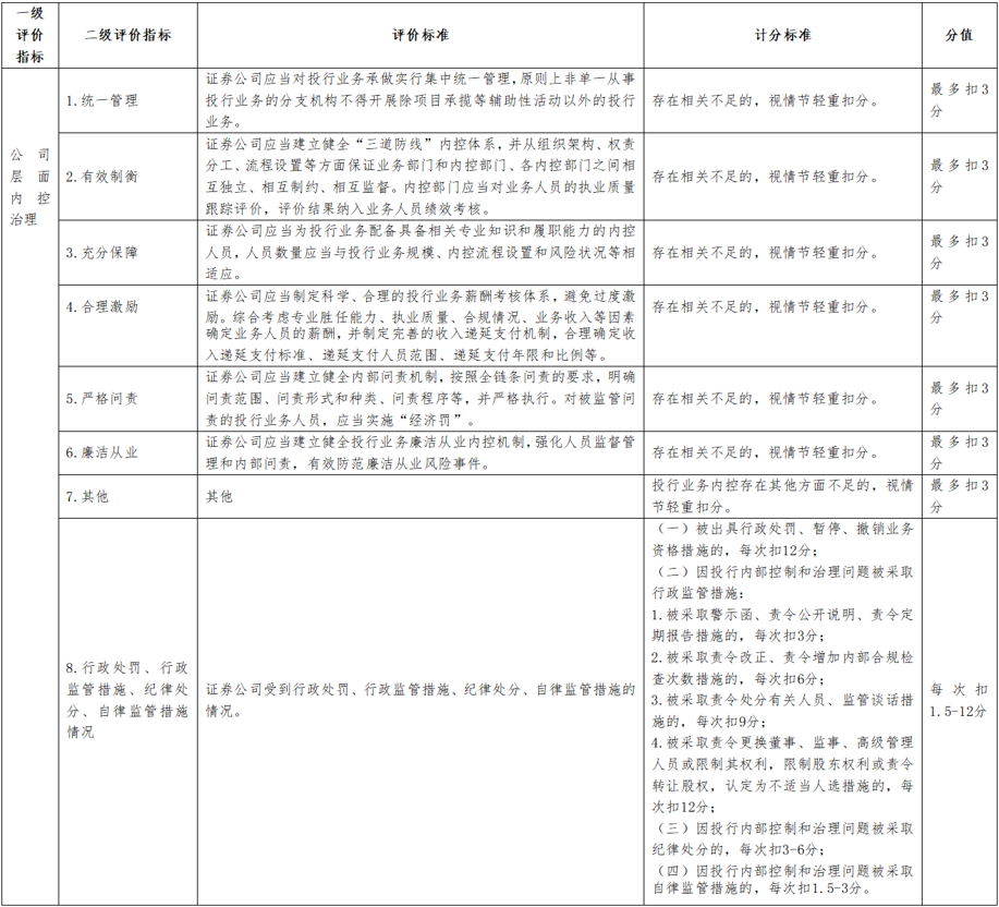 试点期内部控制评价为证券公司投行业务内部控制和治理体系的整体建设运行情况的评价。评价采用扣分方式,根据各类负面事项的扣分标准对基准分进行扣减,直至0分。本项基准分为20分。相关信息由中国证监会及其派出机构提供。