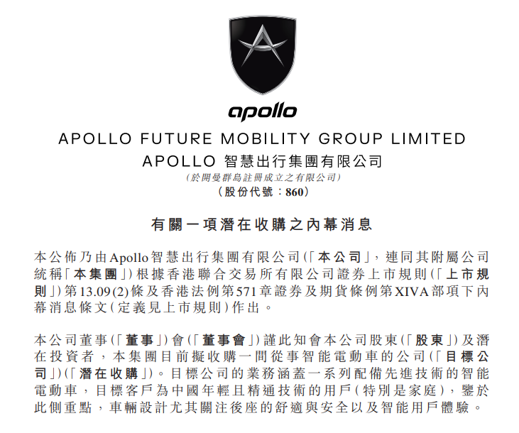 Apollo出行指出,通过潜在收购,本公司可收购立即利用目标公司在中国的成熟业务,包括制造设施、分销网络以及技术专业人员。不过,于本公告日期,这笔潜在收购仍在磋商中,Apollo出行尚未订立最终协议。