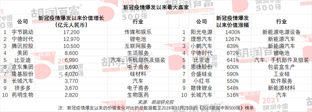 “胡润中国500强的总价值比疫情前增长了30万亿,其中以字节跳动、宁德时代和腾讯为首的前十家增长最多的公司一共增长了7.6万亿,占到四分之一。从涨幅比例来看,新冠疫情爆发以来,这两年价值涨幅最大的前十家公司中,有8家从事新能源相关行业,以主营光伏逆变器等新能源电源设备研发的阳光电源为首,还有4家车企:理想、小鹏、比亚迪和长城,新能源汽车电池供应商宁德时代,锂电原材料供应商赣锋锂业,以及主要从事工业硅及有机硅等硅基新材料产品研发的合盛硅业。”
