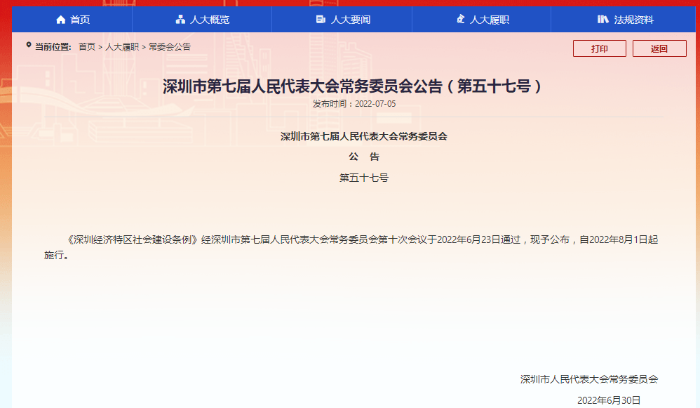 深圳人大网7月5日消息,据深圳市第七届人民代表大会常务委员会公告显示,《深圳经济特区社会建设条例》经深圳市第七届人民代表大会常务委员会第十次会议于2022年6月23日通过,自2022年8月1日起施行。