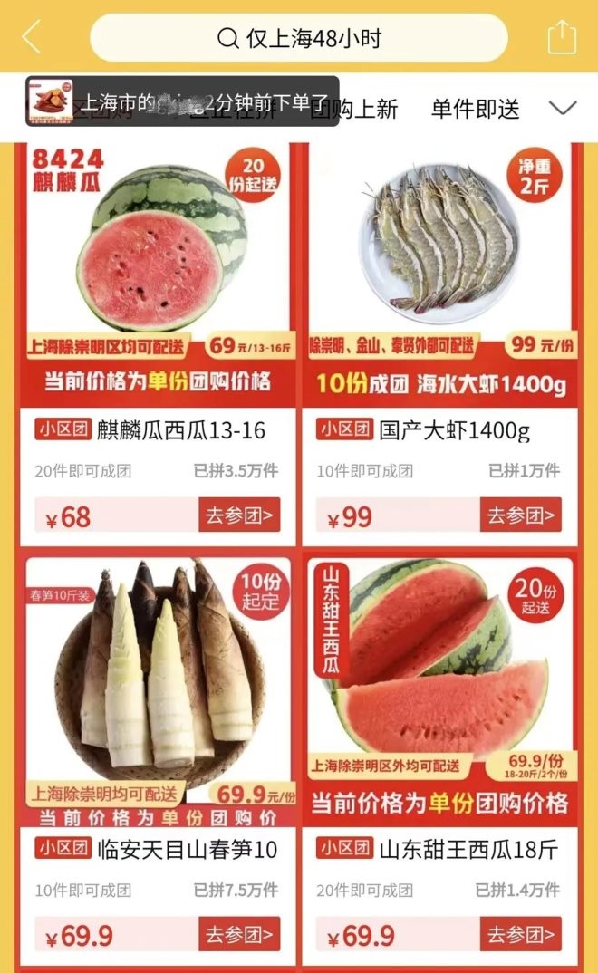 比不上盒马、叮咚、美团、饿了么的速度,但不用卡时间“抢”,且成团后48小时配送,这样的确定性,对疫情中的消费者仍具有不小的诱惑力。