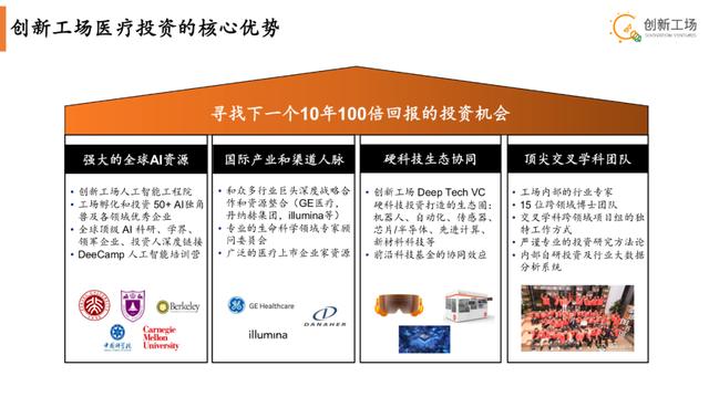 这张PPT我们分享过程中或多或少都提到了,我们作为在医疗赛道投资三年的新的团队,我们也在不停地思考,我们和老牌的基金相比有什么样的优势,我们有什么跟别人不一样的地方,现在有四个点非常重要。第一个,我们有非常强的AI资源,刚才提到了在这么多方向里面大家会注意到几乎每一个方向都或多或少和AI有着千丝万缕的或者非常强的关系,创新工场在实战中看到非常多的企业家希望拥有AI的能力,愿意来跟我们合作。同时我们整个医疗团队有非常强的产业经验,我们跟行业里面的巨头,GE、DANAHER、Illumina都有非常深的战略资源,我们去年进入GE的数字医疗生态圈,也是他们唯一一家合作的VC/PE。