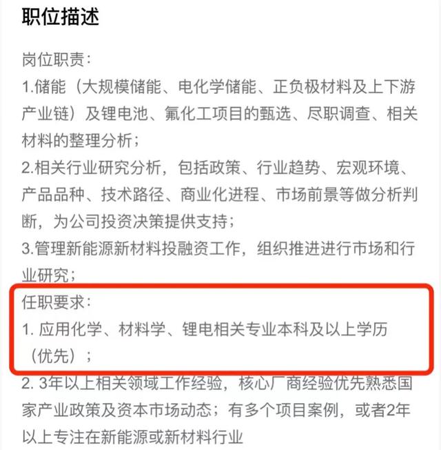 这并非个例。随着新能源火爆,曾经被视为“天坑专业”的化学也开始火了,VC/PE机构点名高薪招化学博士、材料博士。“我们新进的投资人基本上都是海外藤校理科海归,专业包括化学、材料、能源等等。”某头部本土创投合伙人坦言,现在新能源赛道竞争激烈,但门槛不低,专业对口的候选人才可能有望撬动他们的校友圈资源。
