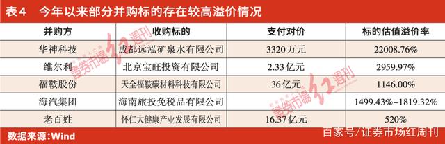 《红周刊》梳理近期关联收购的标的估值溢价时发现,仍然有标的资产的评估增值率高达数十倍甚至上百倍的交易方案。(见表4)比如,华神科技于6月6日发布公告称,公司拟通过全资子公司出资3320万元收购成都远泓矿泉水有限公司(以下简称“远泓矿泉水”)100%股权。截至今年4月30日,标的公司远泓矿泉水账面净资产为15.06万元,评估价值为3329.58万元,本次收购的溢价率高达220倍。同时,远泓矿泉水处于亏损状态,2021年和今年前四个月,远泓矿泉水净利润分别为-849.15万元、-182.13万元。
