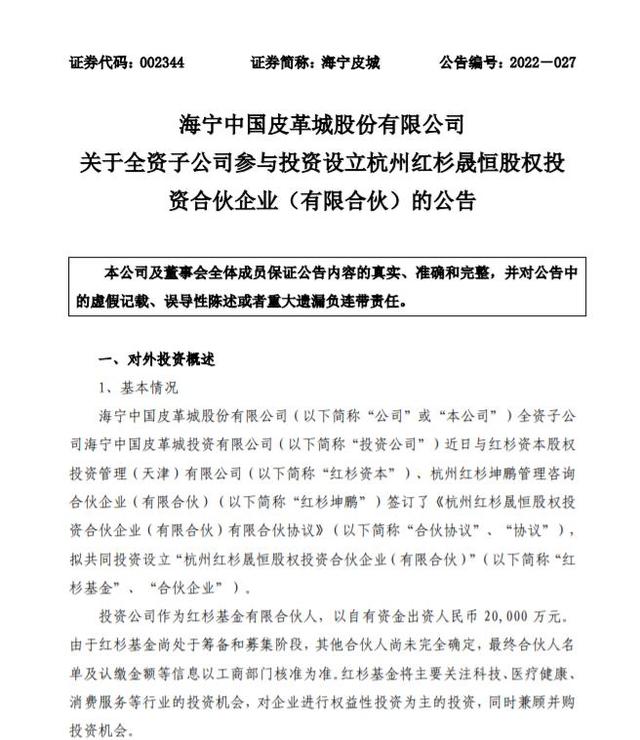 投资界8月2日消息,海宁中国皮革城股份有限公司(海宁皮城)日前发布关于全资子公司参与投资设立杭州红杉晟恒股权投资合伙企业(有限合伙)的公告,据公告:海宁皮城全资子公司海宁中国皮革城投资有限公司(海宁皮城投资)近日与红杉资本股权投资管理(天津)有限公司(“红杉资本”)、杭州红杉坤鹏管理咨询合伙企业(有限合伙)(红杉坤鹏)签订了《杭州红杉晟恒股权投资合伙企业(有限合伙)有限合伙协议》,拟共同投资设立“杭州红杉晟恒股权投资合伙企业(有限合伙)”(“红杉基金”)。