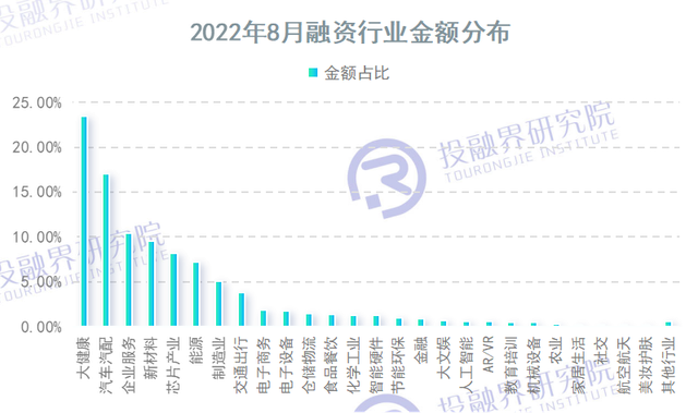 融资行业金额分布方面,大健康行业依旧稳稳登顶,8月融资151.17亿元,占比23.45%。融资金额排在前十的行业,在大健康之后,还有汽车汽配、企业服务、新材料、芯片产业、能源、制造业、交通出行、电子商务、电子设备、仓储物流。