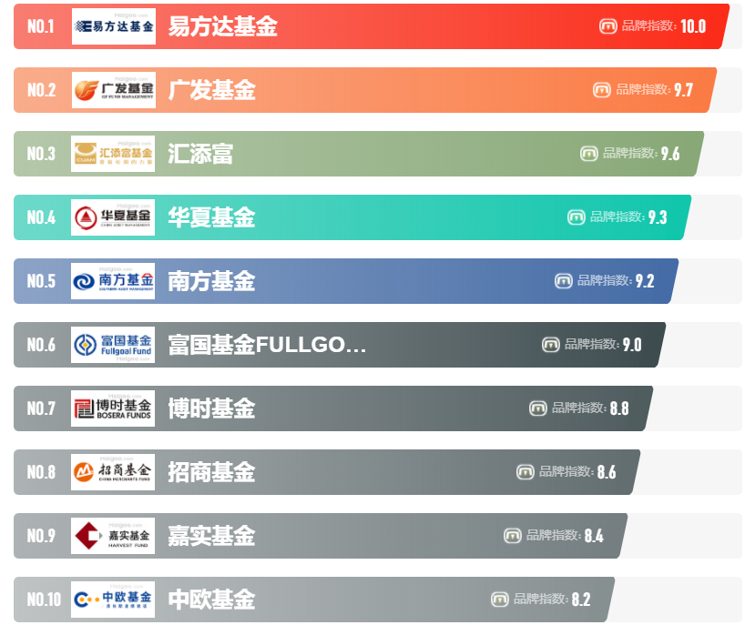 2022年基金业协会数据根据资产管理规模十大基金公司依次排名:易方达基金以11362亿人民币资产规模问鼎行业第一,成为基金之王;广发基金位列第二;汇添富基金位列第三;后面依次是:华夏基金、南方基金、富国基金、博时基金、招商基金、嘉实基金、中欧基金。