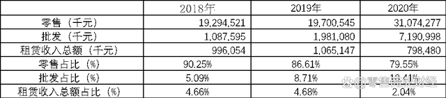 从物美科技2021年的招股说明书中可以看到,物美科技收入主要分为零售、批发及租金收入三部分。其中的“批发”业务,即针对企业用户或商户进行的“团购”业务,是物美商业模式与其它零售商超不同的地方。在收购麦德龙后,这部分业务的比重占比接近20%。