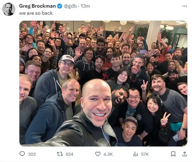 布罗克曼发布了与数十名员工的自拍照,并配文:“我们真回来了。”