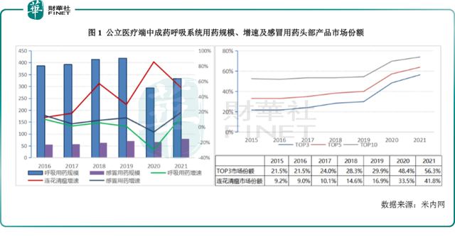 据米内网数据,以岭药业的感冒用药产品TOP3保持双位数快速增长,市场份额逐步提升,TOP3市场份额由2015年的21.51%提升至2021年的56.30%,公司的连花清瘟占据市场绝对优势。