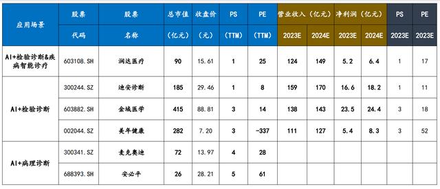 院内信息化布局的企业有卫宁健康、创业慧康、东华软件、东软集团、万达信息、久远银海;电子病历+医院数据中心相关标的为嘉和美康;自动化药房布局的企业有健麾信息、艾隆科技。AI+医疗器械相关标的为乐普医疗、伟思医疗、天智航;AI辅助药物设计相关公司为成都先导、药石科技、泓博医药、药明康德、皓元医药。