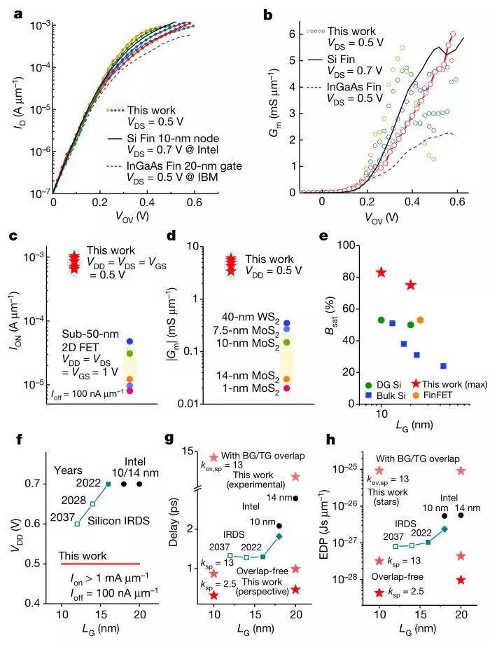 作者测试了二维InSe FET的性能,并直接与Intel商用10纳米节点的硅基Fin FET和IBM的20纳米栅极InGaAs Fin FET进行比较(关态电流为100 nA μm−1)。二维InSe FET的饱和电流与硅基Fin FET相当,但工作电压低得多,仅为0.5 V(硅基Fin FET为0.7 V),也优于InGaAs Fin FET。这种二维InSe FET实现了6 mS μm−1(0.5 V) 的跨导,这也是所有报道的低维纳米材料 FET的最高值,与Intel商用10纳米节点的硅基Fin FET相当但工作电压较低(0.5 V),比IBM的InGaAs Fin FET高三倍。作者还比较了这种二维InSe FET与其他短沟道二维 FET的开态性能参数。在VDD= 0.5 V的超低电压下,二维InSe FET的开态电流范围为0.7 - 1.2 mA μm−1,跨导范围为3 - 6 mS μm−1,大约比其他二维 FET高一个数量级。二维InSe FET饱和区域的弹道率高达83%,这是迄今为止二维 FET的最高记录,超过了之前报道的所有硅基 FET。二维InSe FET中的高载流子热速度和弹道率、超薄HfO2双栅结构和源/漏欧姆接触将跨导提高到创纪录的6 mS μm−1,因此,二维InSe FET的VDD可降低到0.5 V(优于IRDS预测的2037年硅基极限的0.6 V),同时仍然能够将器件电流从100 nA μm−1(关态)打开到超过1 mA μm−1(开态),这在硅基单片MOS FET是不可能实现的。得益于0.5 V的超低电压和超过1 mA μm−1的开态电流,二维InSe FET在栅极延时和功耗延迟积(EDP)方面比硅基 FET表现更优。最佳10 nm栅长二维InSe FET的延迟为0.32 ps (ksp= 2.5) 和0.87 ps (ksp= 13),优于IRDS 2022预测的硅基 FET的极限延迟1.32 ps(12 nm栅长);EDP低至4.32 ×10−29Js μm−1(ksp= 2.5) 和3.20 ×10−28Js μm−1(ksp= 13),比硅基 FET的预测极限低一个数量级。二维InSe FET具有理想的开关行为,包括亚阈值摆幅75 mV per decade,DIBL仅22 mVV−1,电流开/关比超过7个数量级,优于目前最先进的硅基FinFET技术。